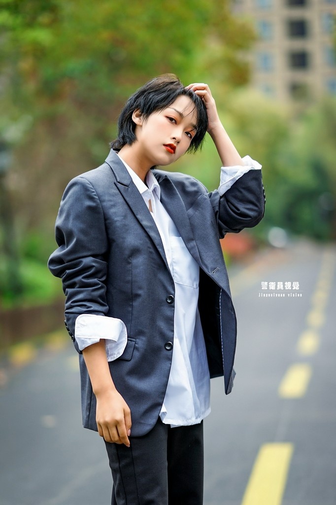 短发轻扬若剪裁, 素衣浅衬净无埃。 眉弯似月含春浅, 眼澈如溪映雪开。