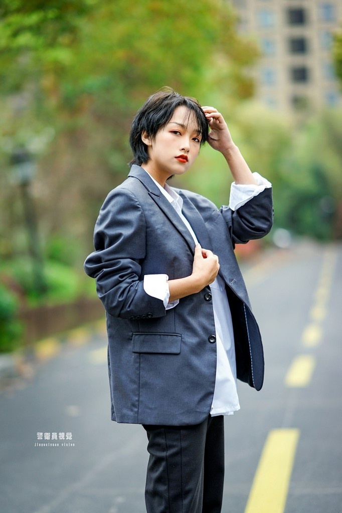 短发轻扬若剪裁, 素衣浅衬净无埃。 眉弯似月含春浅, 眼澈如溪映雪开。